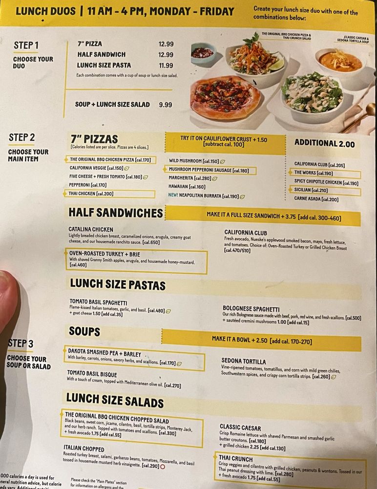 BBQ sauce, chicken, and mozzarella. [cal. 590]. Sub plant-based chicken for an additional charge [subtract cal. 10]. Can be made validated gluten-free